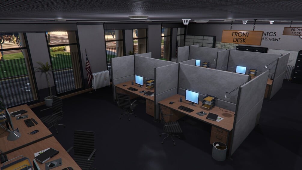 It has 25 rooms including: 4 single offices, 1 mass office, 1 control center, 1 mugshot, 2 interregation rooms, 1 evidence room, Cells (6), weaponary, reception, 2 toilets, 1